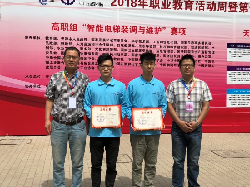 201854日至8日全国职业院校技能大赛高职组智能电梯装调与维护赛项在天津举行。比赛由教育部、发改委、科技部等单位主办、天津市教育委员会承办,来自全国31个省、自治区、直辖市的81所高职院校的共162名选手进行了激烈角逐。来自公司永利23411集团电梯专业的吴浩伟和机电专业的张定俊代表浙江省参见了此次竞赛。在金新锋和崔富义老师的共同指导下,公司两名参赛选手经过5个小时紧张地全封闭角逐,在比赛中沉着应战,紧密合作,最终获得了国赛三等奖。