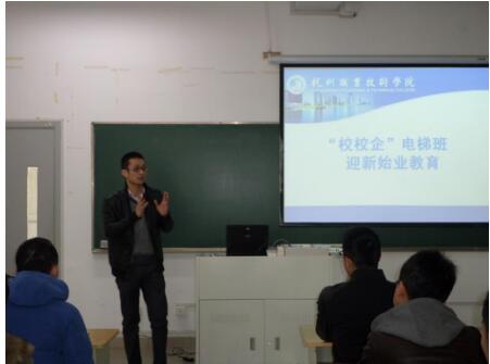 3月11日上午,2015年首期“校校企”电梯班新生始业教育在友嘉机电学院2509教室举行,大会由继教院副经理黄允政主持。友嘉机电学院副经理潘建峰对电梯班员工的培养方案进行了解读,杭州容安特种设备有限公司韩霁副总经理介绍了公司培训情况,友嘉学工办主任傅淑燕就员工管理规定及安全教育等对同学们提出了要求及希望。