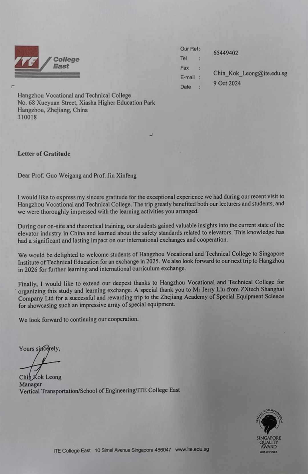 这封感谢信不仅加深了两校之间的国际化友谊,也为双方在教育领域的国际化合作谱写了新的篇章,是杭职院电梯工程技术专业国际化发展的里程碑。接下来学院将持续深化国际化教育协作项目,推动教育联动成效,为国际化教育联动发展努力探索新路。