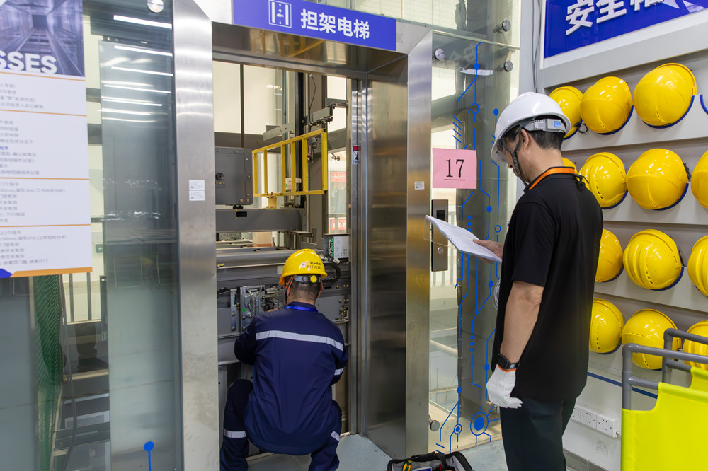 在实训基地,参赛选手需在规定时间内(1小时)找出故障。这群身着特检工作服的医生,使用电梯检验专业仪器,查机房、看轿厢、看底坑、探井道……经过一道道细致检测排查,为电梯进行全面“体检”。裁判组重点观察选手对《电梯监督检验和定期检验规则》的熟练掌握情况,从“检验流程规范性、数据采集精准度、隐患判定逻辑性”三个维度进行评分。