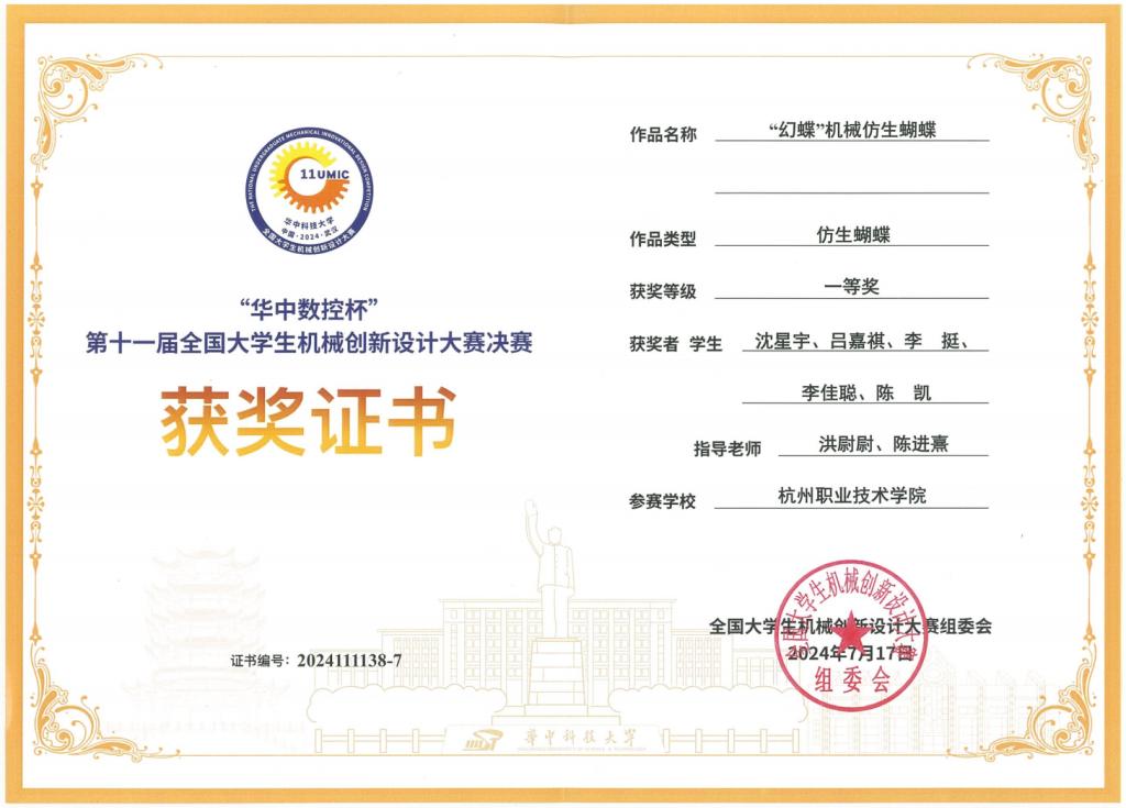 7月15日至7月18日,“华中数控杯”第十一届全国老员工机械创新设计大赛决赛在华中科技大学举行。杭职学子再创辉煌,共获一等奖1项(最高奖),二等奖1项。