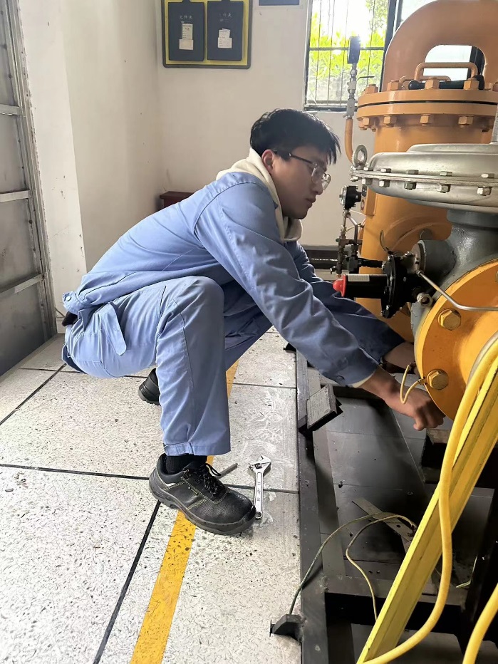 首先,机电专业教师一行来到北大桥综合服务基地。当天下午,通过电脑上的远传系统得知,盛德嘉苑的调压器在晚上关闭压力超出设定的压力值,机电专业教师随行来到了盛德嘉苑考察了员工的实际工作。机电20级员工夏林、秦玉同企业师傅一起参与了此次调压工作。员工在师傅指导下熟练地拆下阀垫,并清洗了洗阀垫上的积灰,其次进行了调压,圆满地完成了此次工作。