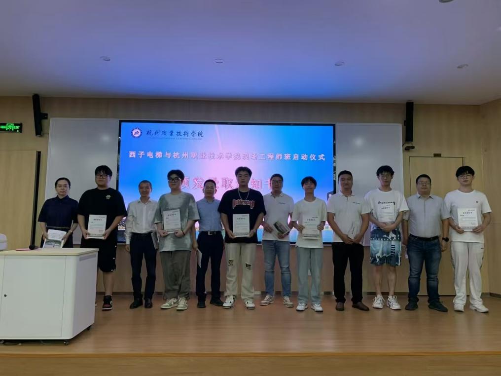 郭伟刚在仪式上致辞。他指出,“现场工程师”作为一种新型的职业教育培养模式,是深化产教融合、校企合作,推进工学结合、知行合一的有效途径;是学校服务地方经济、促进社会发展的重要举措。他强调,企业导师们要充分发挥自己的专业优势和实践经验,提供优质的教学服务;员工要珍惜学习机会、适应新的培养模式,保持职业操守和道德,将所学技能和知识应用于实践,为社会作出贡献。俞斌介绍了现场工程师项目和西子电梯人才培养特色,从公司概况,企业文化,公司环境,员工学习过程,培养模式,晋升渠道等多方面进行了详细说明。邵期欢分享了自己的职业生涯,鼓励同学们要认真学习,实现自我价值。最后,与会领导和嘉宾给员工颁发了西子电梯-杭职院首届“现场工程师”录取通知书,并合影留念。