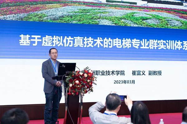 在研讨环节,崔富义作题为《基于虚拟仿真技术的电梯专业群实训体系重构》的主题报告,他从学院概况、建设背景、实践做法、取得的成果四个方面介绍了公司永利23411集团在电梯专业群国家级职业教育虚拟仿真实训基地建设方面的探索和实践。