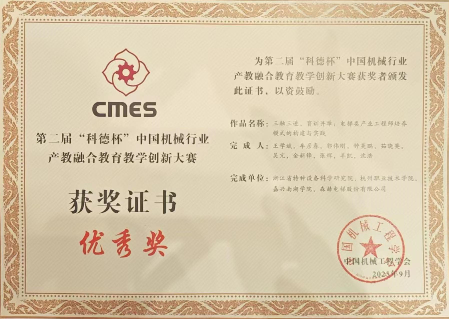 9月19日至22日,第二届“科德杯”中国机械行业产教融合教学创新大赛全国总决赛在广州举行。公司与浙江省特种设备科学研究院联合申报的《三融三进、育训并举:电梯类产业工程师培养模式的构建与实践》项目荣获企业组优秀奖(一等奖),跻身全国六强。