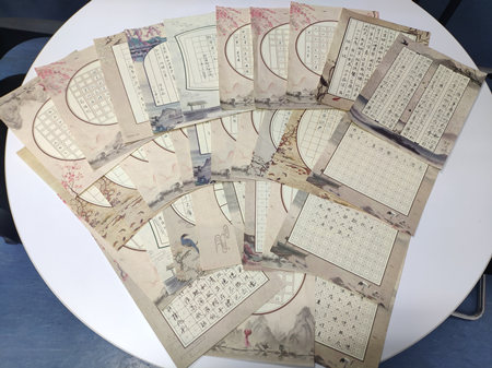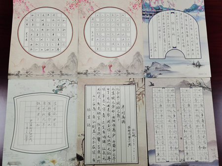 公司领导带头参与,老师们也都十分积极踊跃。有的精心挑选花笺纸,有的写了又写,几易其稿,有的用不同字体精心写了多幅,挑选两幅参赛,也有的匆匆上阵,但大家都尽量在既定时间高质量的完成任务。书法作品有楷书、隶书、行书,也有自由体,字迹或苍劲有力或娟秀飘逸,与花笺纸上别致的图案相呼应,赏心悦目。