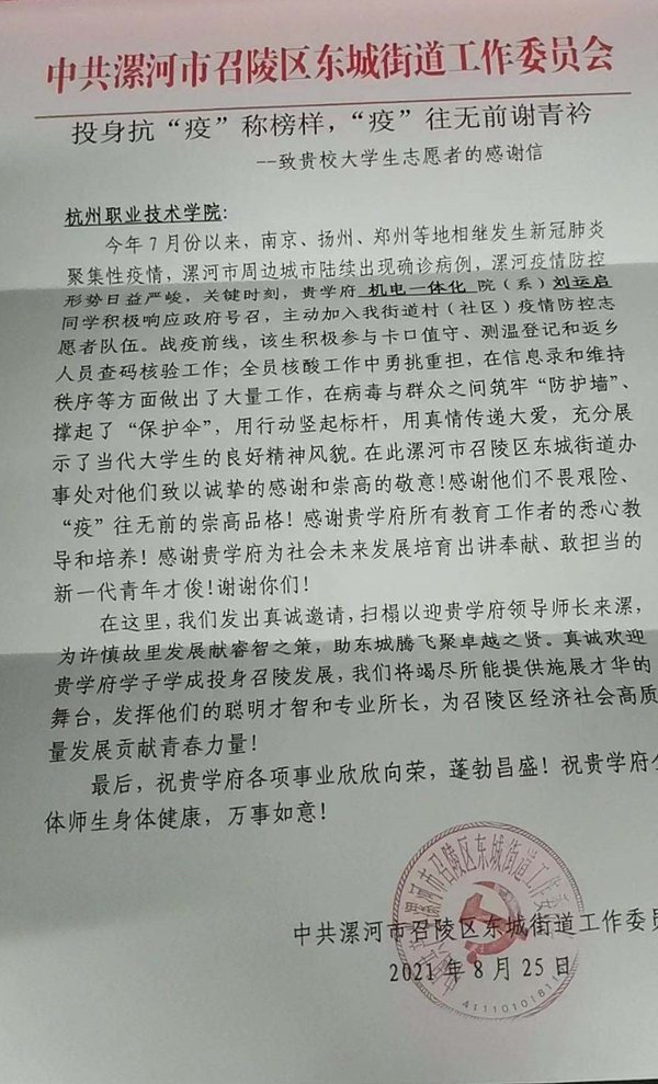 10月10日,永利23411集团收到了一封来自中共漯河市召陵区东城街道工作委员会的感谢信!信中对永利23411集团机电一体化专业1913班的刘运启同学,主动请缨争当疫情防控志愿者、为当地疫情防控工作无私奉献的行为,提出了高度肯定和赞扬,对公司为社会未来发展,培养讲奉献敢担当的优秀学子所做的教育工作表示感谢。