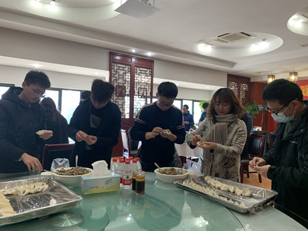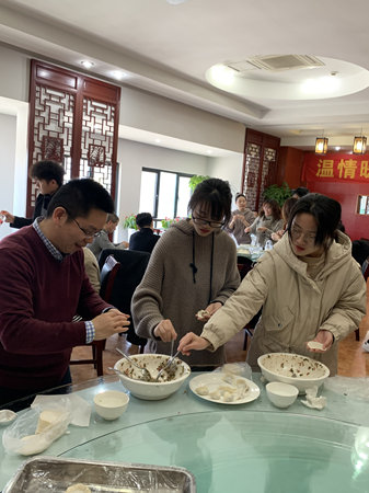 中午11点左右,老师们分批抵达餐厅。在食堂工作人员的帮助下,桌上早就摆满了各种馅料和饺子皮,有芹菜猪肉馅的、白菜馅的、荠菜馅、韭菜鸡蛋馅等。大家纷纷出手,向大盆的饺子馅和饺子皮进军。平时经常摆弄机械类器具的理工科老师,此时也微翘兰花指做起了花边,真是“下得了车间,入得了厨房”。没多久出现了形状各异的水饺,有修身版的,有肥胖型的,有褶边装饰颜值能打的,有素颜出镜的。看到成品,大家都开心地笑了,互相打趣,互相探讨。当然,有零星几个“厨房小白”秒变好员工,很用心地向身边的“巧手”学习包饺子。做中学,学中做,边学边实践,边学边改进,大家热情高涨,包得起劲,不一会儿装饺子的托盘就一盘一盘满了起来。