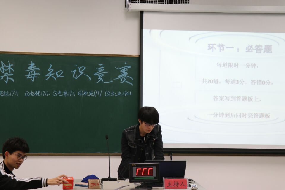 参加本次活动的共有5支队伍,分别来自2017级的五个班级,他们为自己班级代表队都取了响亮的队名,诸如:“一个打四个”、“敖雄队”、“天霸动霸tua~”等,体现了他们的青春活力和奋勇争先的精神风貌。本次比赛共设两个环节:必答和抢答。第一部分是必答题,每支队伍都出色地完成了所有内容,看得出他们在此之前都进行了禁毒相关知识的学习,为本次比赛作好了精心地准备。本次环节结束,电梯1711和电梯1712班暂时领先,积分并列第一。在第二个抢答环节中,气氛达到了本次比赛的高潮,队员们手触抢答器,只待一声“开始抢答”指令。电梯1721班的队员频频出手中的,为本队赢得了多次的答题机会,最终局势扭转,成为本次禁毒知识竞赛的冠军队。