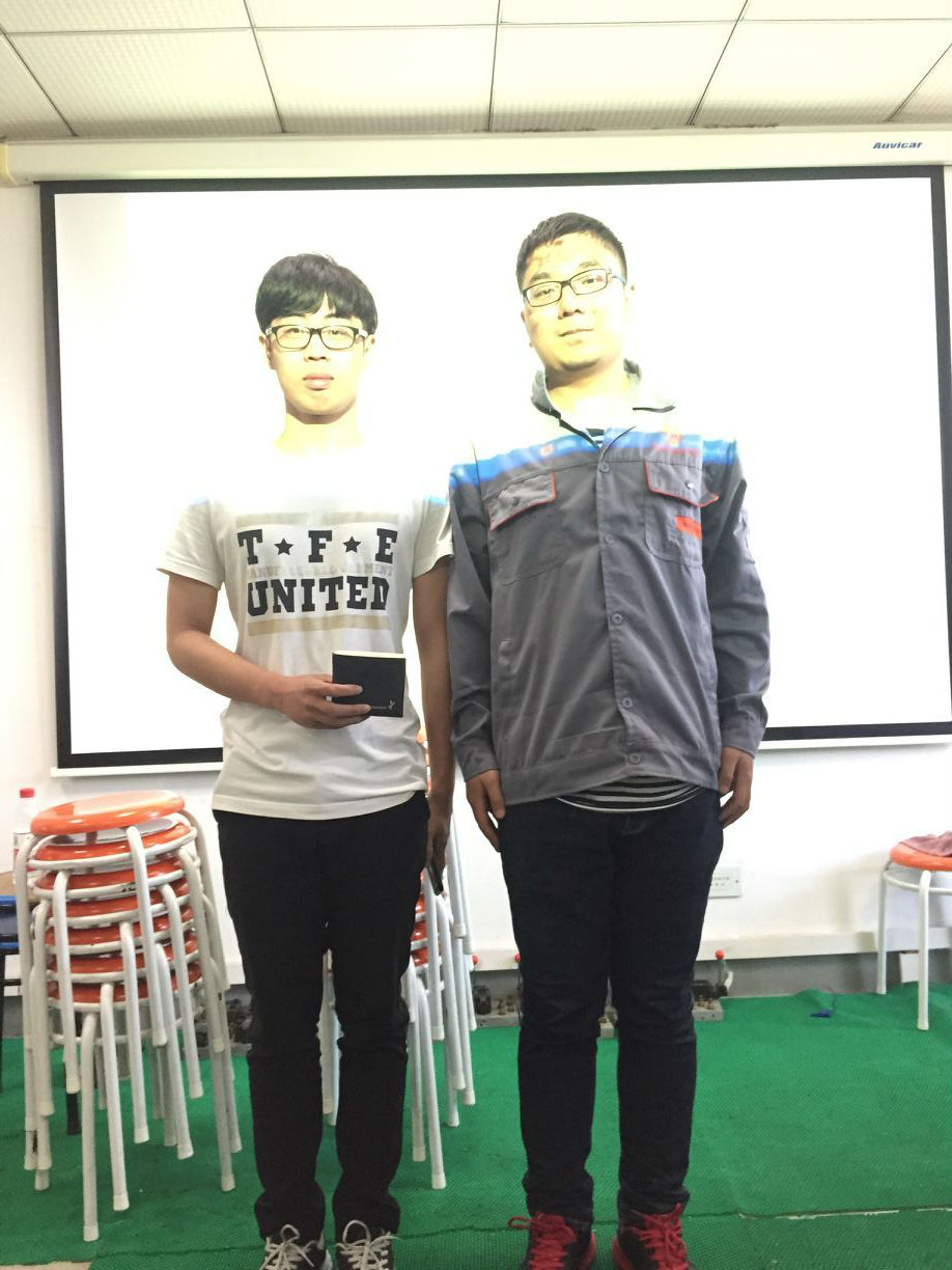 故事是这样的:今天早上,程毓同学在校园里参加完晨跑后,就早早来到了公共实训基地五楼的液压实训室,实训教室里面只有任课老师和三、两个同学,他就走到了自己最里面的位置,由于里面都是实训设备,他的位置比较隐蔽。当他准备开始练习操作时,突然看见在操作台下面的角落里有一个白色的东西,于是他弯下身去,捡起来一看竟然是一个鼓鼓的钱包,里面有厚厚一摞百元钞票,他发现钱包里除了钱以外还有身份证和银行卡,身份证上的名字写着“宋洁”,由于我们学院人员比较少,他能肯定失主不是自己学院的,于是,他就主动交给了上课的洪尉尉老师。这时,铃声响起,他们便开始上课了。过了一会儿,作为教学督导老师的我刚好巡视到他们班,知道这个事情后,便向负责那边实训室的黄河老师了解到,上周五使用过这个实训室的是友嘉机电学院的员工,于是,马上和他们辅导员联系,终于查到“宋洁”为数控1651班的同学。宋洁同学于第二节下课后来到了实训室,程毓亲手把钱包交到了宋洁的手中,两人还互留了联系方式并合了影,我想他们肯定能成为好朋友的。