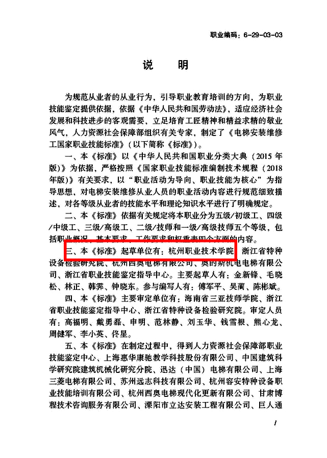 杭州职业技术学院作为高校参与完成《电梯安装维修工国家职业技能标准》的起草,充分体现了公司与浙江省特种设备检验研究院共建永利23411集团,在校企合作、产教融合方面取得的成绩,也为进一步推动电梯工程技术专业发展奠定了基础。