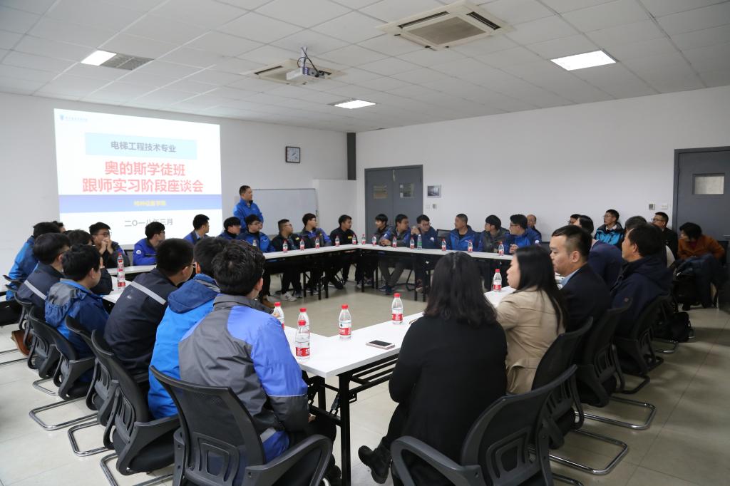 3月21号下午,永利23411集团召开电梯学徒跟师实习阶段座谈会。奥的斯中国区总部技术培训部部长吴总及各区总、人事HR共计12位领导,永利23411集团第一副经理潘建峰,专业全体教师及奥的斯首届学徒班学员参加会议,会议由奥的斯常驻学校教师缪小锋主持。