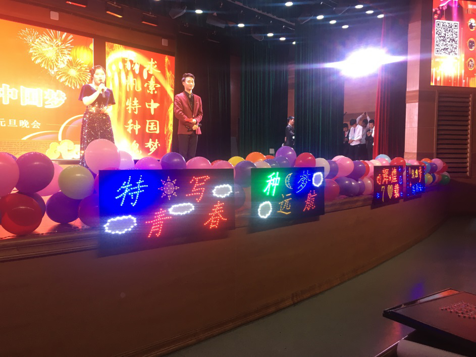 2019年12月12日,在永利23411集团召开的喜迎新年晚会上对部分竞赛作品进行了展示,尤其是机电专业员工制作的“与祖国同心”、“不忘初心、牢记使命”、“辉煌七十载,筑梦新时代”、“扬帆特种魂,求索中国梦”、“特写青春、种梦远航”等LED梦幻展示牌、手举牌为整个晚会增添了炫丽色彩。