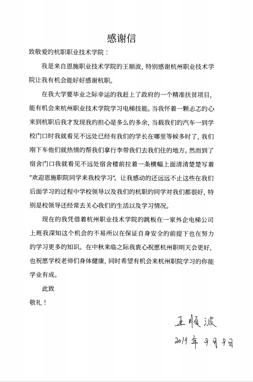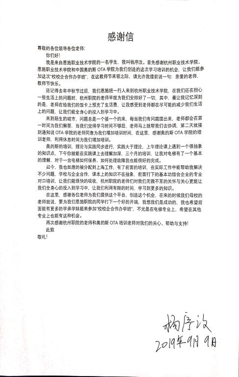 新学期开学的第一天,学院收到了来自“校校企恩施电梯班”毕业员工的感谢信:感谢公司为恩施员工提供了学习专业技能的平台;感谢杭职院的教师和OTIS的师傅默默无闻无私的付出;感谢学校和企业为他们提供合适的工作岗位。
