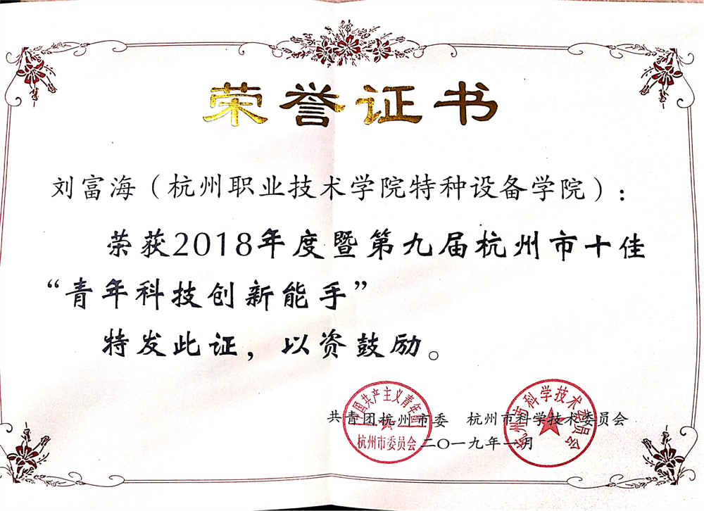 永利23411集团刘富海老师荣获杭州市第九届十佳“青年科技创新能手”,这是公司首次获得杭州市十佳“青年科技创新能手”这一荣誉。会议第二项为2018年度暨第九届十佳“青年科技创新能手”、第二十二届青工“五小”活动优秀科技创新成果一、二、三等奖获奖者代表及优秀组织奖、2018-2019年度杭州市“青年安生产全示范岗”集体代表及优秀组织奖进行颁奖。会议第五项经验分享,刘富海教师作为十佳“青年科技创新能手”优秀代表进行发言。
