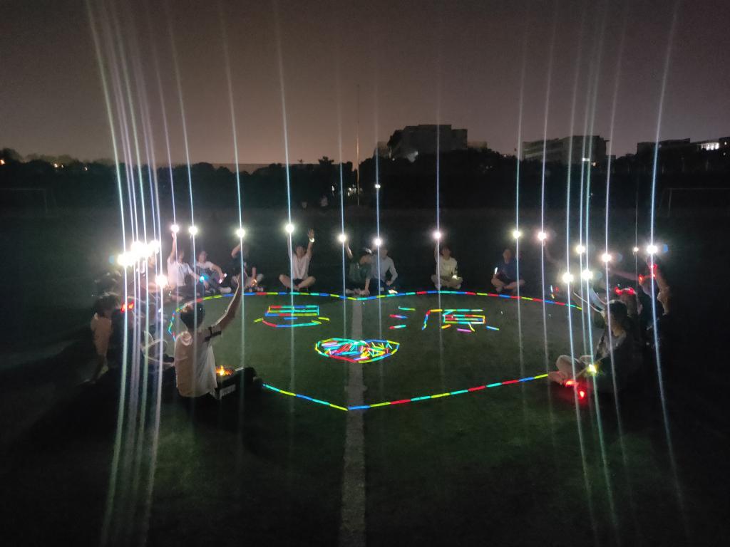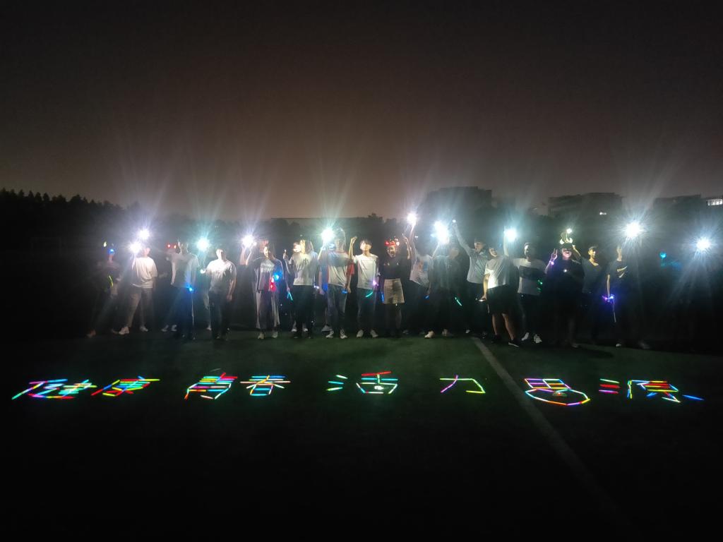 在第二环节中,同学们戴上了夜光道具,环校园跑步一圈来到操场上,以丰富的想象,摆出“健康青春,活力思源”字样,随着闪耀的彩色光源,八个大字在操场上闪闪发光,熠熠生辉,他是每位同学心中光芒的展现,引得其他学院的同学们前来围观。同学们围坐在操场上,敞开心扉,各抒己见,从学习谈到生活,从学校谈到工作,从当前谈到未来,无不散发着青春的活力。