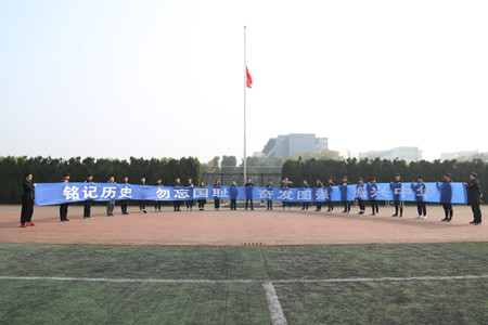 上午10时,同学们在学校操场国旗下怀着沉重的心情庄严肃立,对南京大屠杀中逝去的同胞进行默哀。静立默哀过程中,同学们用无声的语言致敬英烈,表达着对逝者的哀思。默哀仪式结束后,全体同学在印有“铭记历史,勿忘国耻,奋发图强,振兴中华”横幅上庄严签下自己的名字和对和平的祈愿,以此缅怀南京大屠杀的无辜死难同胞。