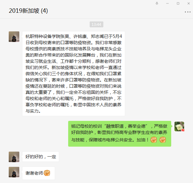 5月7日中午,永利23411集团收到了来自新加坡实习就业员工的感谢信。信中写到:“杭职永利23411集团员工张昊、许铭康、郑志禹已于5月6日收到母校寄来的口罩等防疫物资。我们非常感激母校提供的高素质技术技能培养及与电梯龙头企业奥的斯合作带来的的国际化发展舞台,我们在新加坡实习就业生活、工作都十分顺利,感谢老师们对我们的关怀。新加坡疫情以来学校和老师一直通过微信关心我们三个的身体状况,在得知我们口罩紧缺的情况下,寄来许多口罩等防疫物资。在新加坡疫情还在蔓延的时候,口罩等防疫物资对我们来说真的太重要了,我们一定会不忘祖国的关怀,不忘母校和老师的关心和嘱托,严格做好自我防护,不辜负学校和老师的嘱托,彰显中国技术人员的素养与实力。”