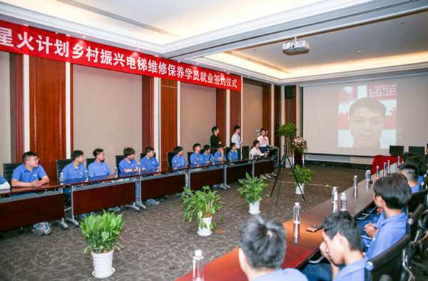 依托电梯人才培养教育资源优势,联合中华职教社、西奥电梯等建立四方协同联动机制,在全国范围内开展”温暖工程”“校校企合作班”等多种形式帮扶,以“总支联动、支部联办、党员联系、校企联手”的党建创新模式和采用免费培养、定向就业的培养方式助力共同富裕。与黔东南民族职业技术学院签订对口帮扶协议,为黔东南台江职业学校、四川广元剑阁职业高中捐赠100万元设备,共建电梯实训基地。项目自立项来,已累计为中西部地区培养了314名专业电梯安装与维修工,带动其家庭走上富裕之路。