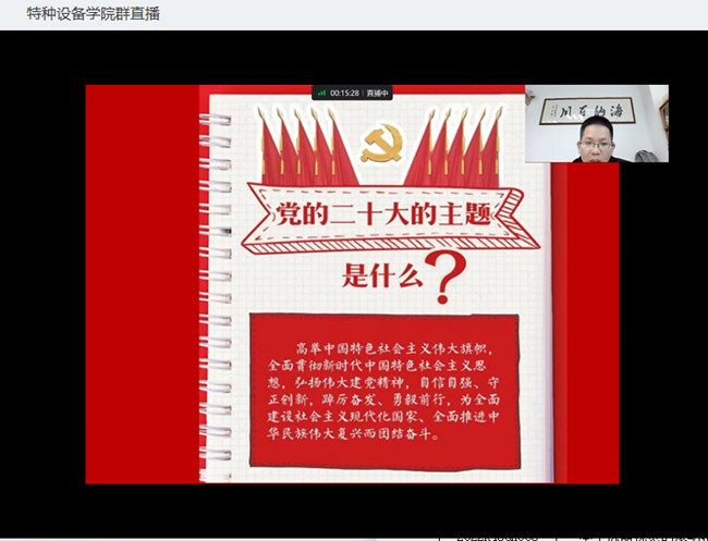 为深入学习贯彻党的二十大精神,把全体教职工的思想和行动统一到党的二十大精神上来,把智慧和力量凝聚到落实党的二十大确定的各项任务上来,12月14日,特种设备公司党总支书记郭伟刚以《学习贯彻党的二十大精神 推进职业教育现代化》为题,为永利23411集团全体教师党员、教职工上了一堂专题党课,宣讲党的二十大精神。