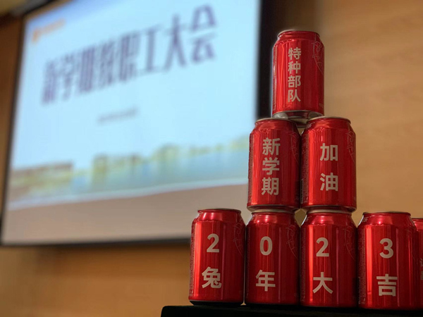 值得一提的是,为增强新的一年开学仪式感和教职工归属感,分院为每位教职工准备了一份特别的新学期礼物——专属定制可乐。每一罐可乐都对应着老师的名字,“兔年大吉”、“未来可期”、“大有作为”、“健康常伴”……可乐上美好而充满希望的祝福语,饱含着永利23411集团对全体教职工的美好祝愿!