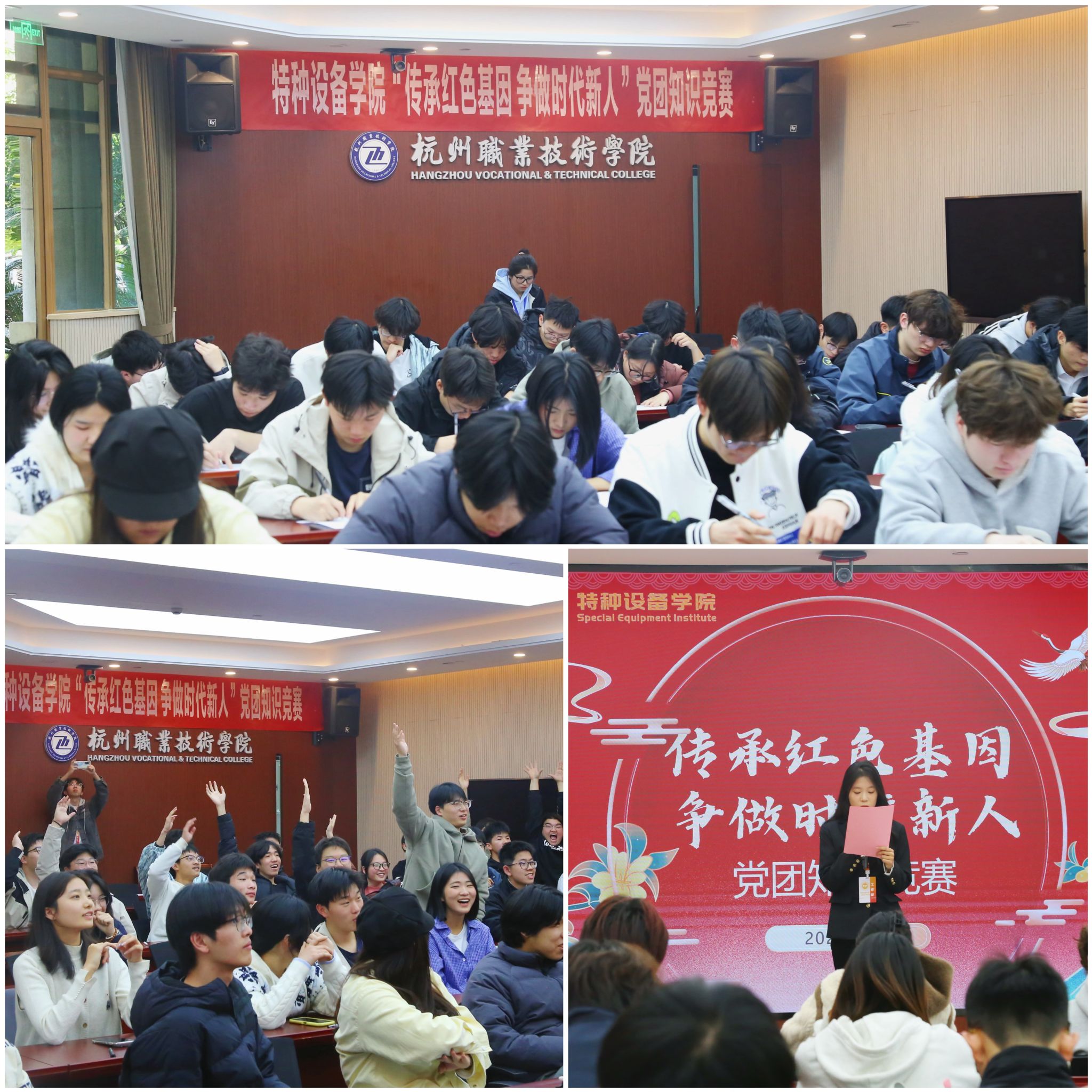 本次竞赛设置“闭卷笔试、团队答题、限时抢答”三个环节,题目涵盖党团理论、历史知识和时事热点等内容,全方位考察青年学子的政治素养与综合能力。赛前,各团支部开启“学霸模式”,组织学习、精心备赛,誓要在赛场上一展风采。比赛现场气氛紧张热烈:笔试环节,同学们凝神静思、沉稳作答;团队答题中,各支部默契配合、对答如流,在抢答环节,选手们争分夺秒,凭借对知识的熟悉程度和快速反应能力,你追我赶,互不相让,将比赛气氛推向高潮。每一次精彩的作答都赢得了现场观众的阵阵掌声!