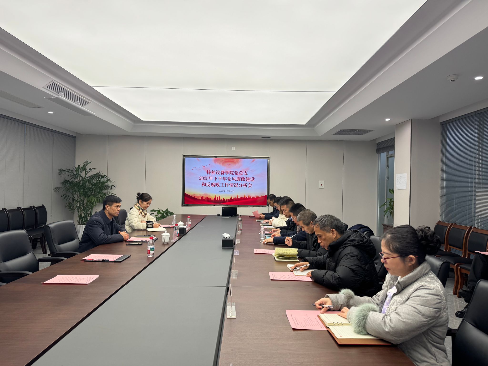 2025年12月24日下午,特种设备公司党总支组织召开2025年下半年党风廉政建设与反腐败工作专题分析会。董事长黄兆信、校纪检委员戴凤微到会指导,分院班子成员、中层干部、党支部书记及教师代表等参加会议。