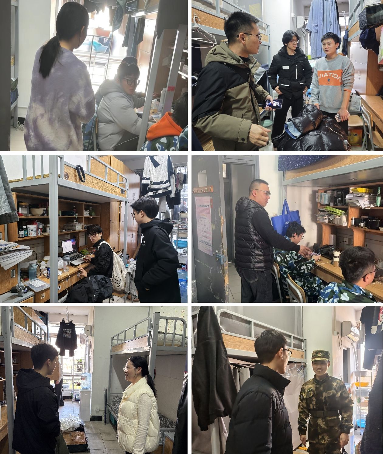 在走访过程中,老师们重点排查了寝室是否存有违规电器、易燃易爆物品等消防安全隐患,对于发现的问题,老师们现场提出整改意见,进行安全教育,并提醒同学们离寝前要做好卫生清理、断水断电。走访期间,老师们也密切关注员工的思想动态与心理状态,细致询问了大家期末复习备考、返乡安排以及日常生活中的困难与需求,对于参加军训的大一员工,鼓励大家通过训练磨炼坚强品格、培养集体意识,争做“特种兵”。雷阳在走访过程中指出,安全是学院做好各项工作的基础,也是同学们成长成才的前提,希望大家能够提升安全防范意识和自我管理能力,同时,假期期间要做到劳逸结合,保持良好的学习状态和生活习惯,为新学期积蓄能量。