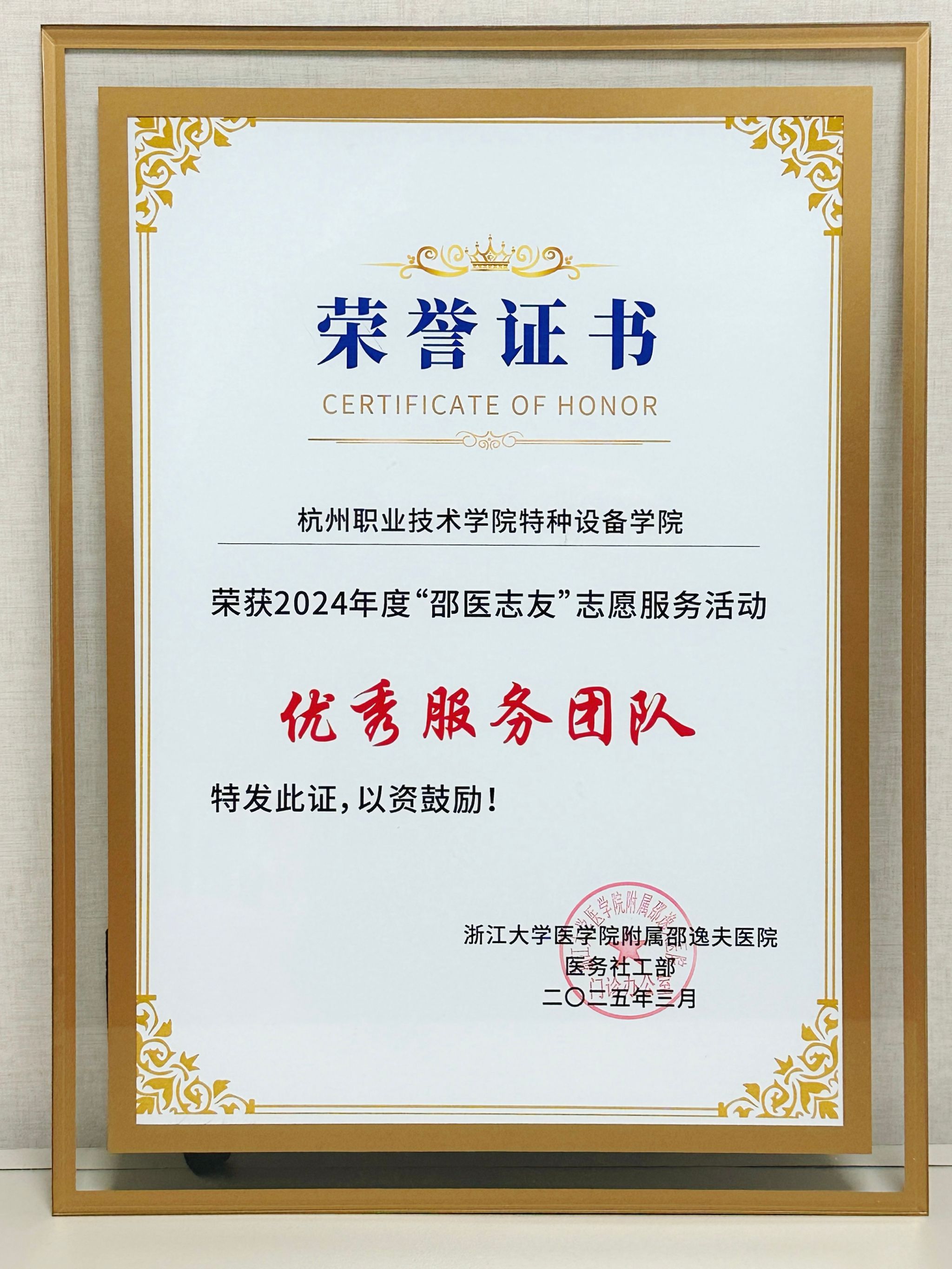 3月5日,浙江大学医学院附属邵逸夫医院2024年度“邵医志友”表彰大会在庆春院区多功能厅隆重举行。永利23411集团志愿者团队凭借出色的志愿服务表现,荣获“优秀服务团队”称号。学院青年志愿者李善珽同学受邀出席表彰大会,并代表团队接受荣誉。