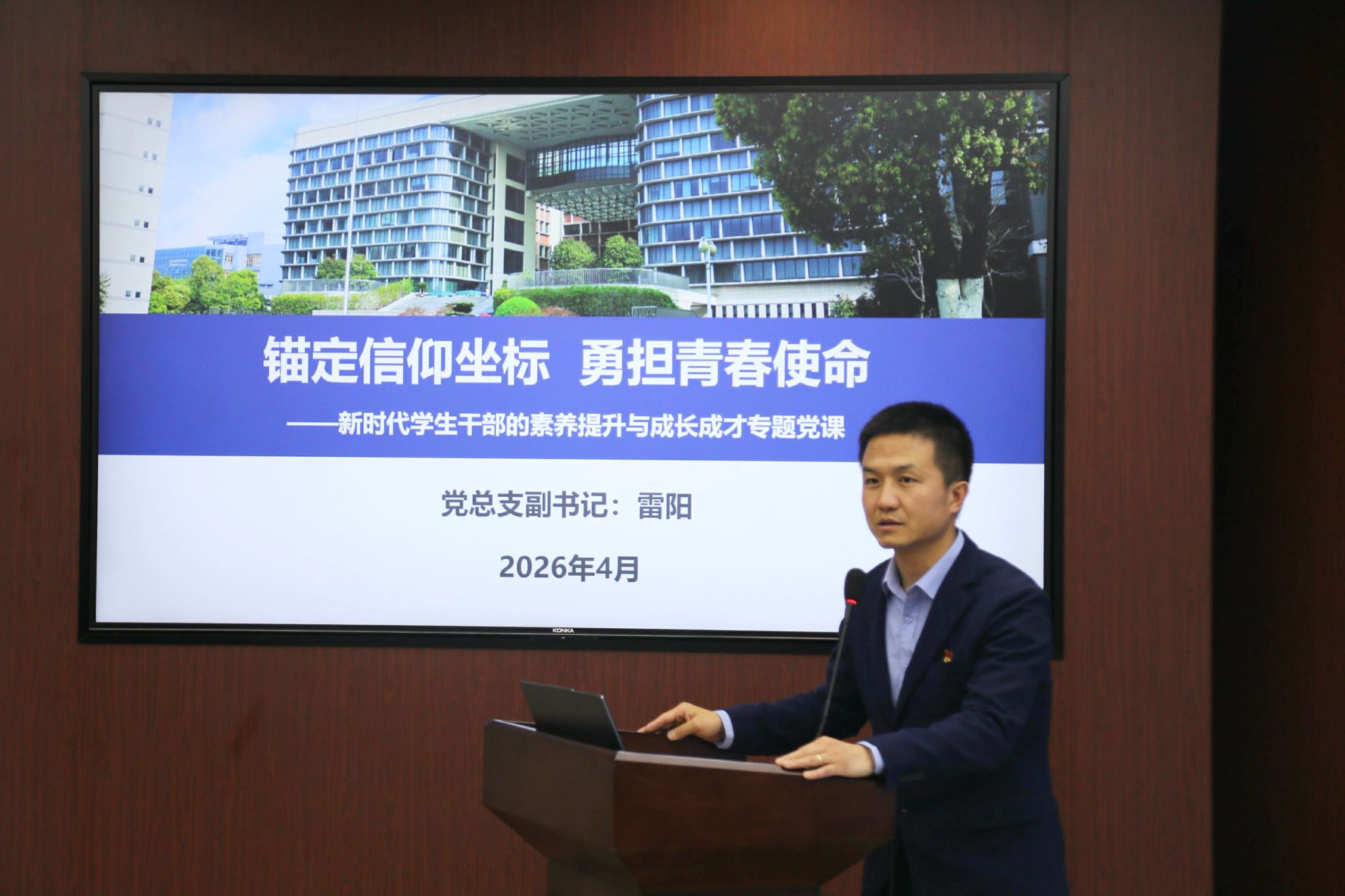 雷阳讲授题为“锚定信仰坐标 勇担青春使命——新时代员工干部的素养提升与成长成才”的主题党课,同时与员工干部开展面对面交流。他阐释了“青马工程”的内涵与办班宗旨,深入分析了青年政治骨干的时代责任,明确要求员工干部“立志做有理想、敢担当、能吃苦、肯奋斗的新时代好青年”,并从政治素养、实践本领与创新思维三个维度提出了核心能力的锤炼路径,鼓励大家在服务同学、奉献校园中实现自我成长。