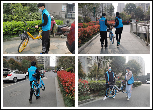 下午一点,12名志愿者分成两组。一组成员手持塑料桶、火钳等工具对小区道路两侧、绿化带的水果皮、烟头、白色垃圾进行清理;二组成员对无序停放的共享单车进行集中整理、规范摆放,同时引导居民将自行车、电动车辆停放在统一停放区域。