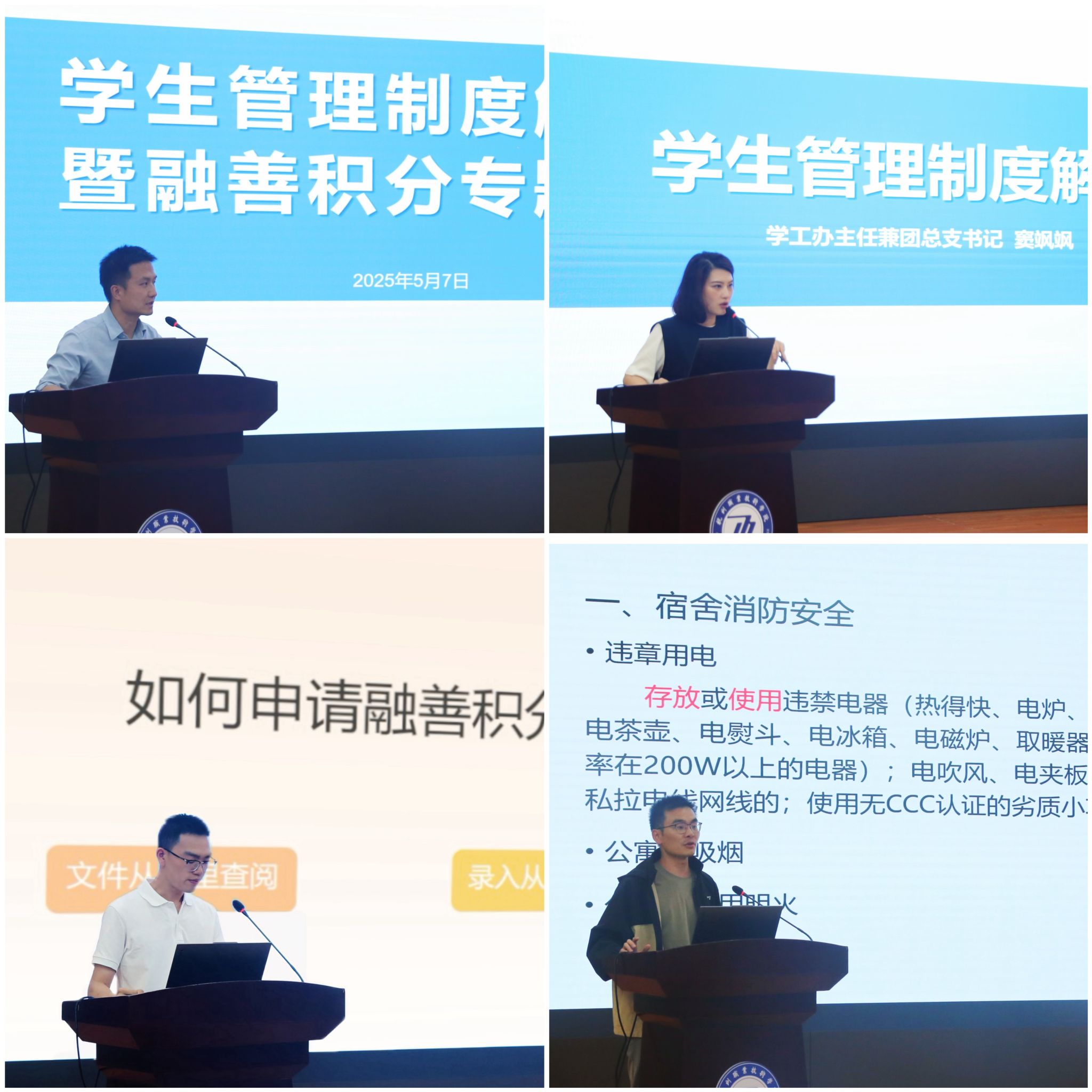 林海峰围绕公寓管理条例和学风建设规范展开详细解读;秦凡介绍了融善积分的重要性、申报途径及积分获取方式;窦飒飒强调了请假销假制度,从意识形态、防范诈骗等角度提醒同学们严格遵守规章制度,切实增强安全防范意识。