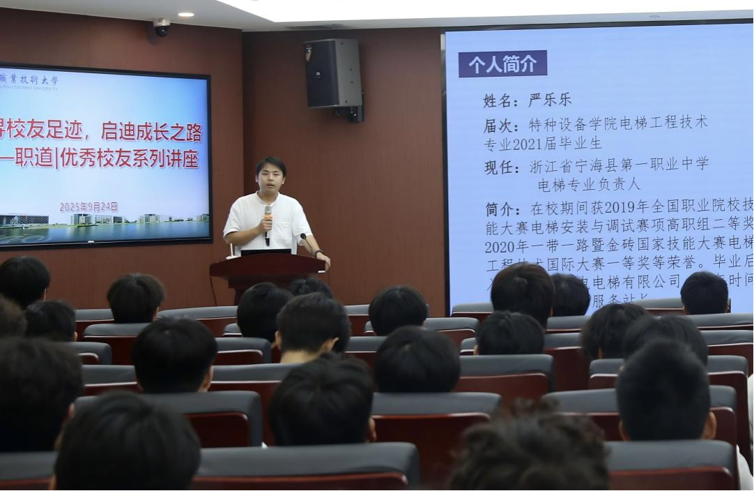9月24日下午,公司永利23411集团电梯工程技术专业2021届优秀员工、现任宁海县第一职业中学电梯专业负责人严乐乐重返母校,为师生带来了一场题为《在方寸梯间,筑人生高度》的精彩讲座。学工部副部长张园园,永利23411集团分管员工工作副书记雷阳,学工办主任、辅导员及百余名同学共同参加。